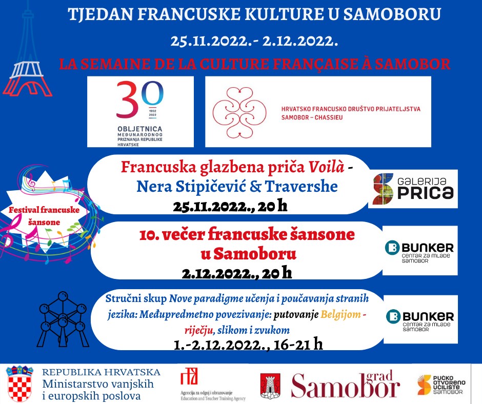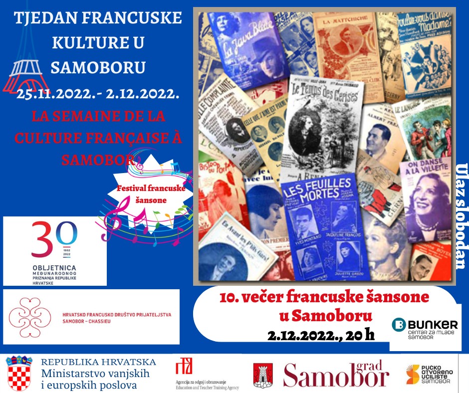 Pridružite nam se u Tjednu francuske kulture u Samoboru koji se održava od 25.studenog do 2.prosinca 2022. povodom Dana profesora francuskog jezika.  U završnoj večeri, na 10. večeri francuske šansone u Samoboru, nastupaju mali i veliki ljubitelji šansone. Podržite učenike i profesore naše škole, pjevače, plesače i svirače, 2.prosinca 2022. u 20h u Bunkeru.