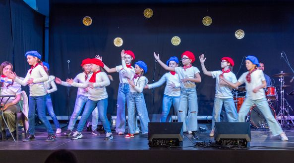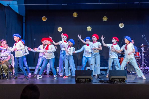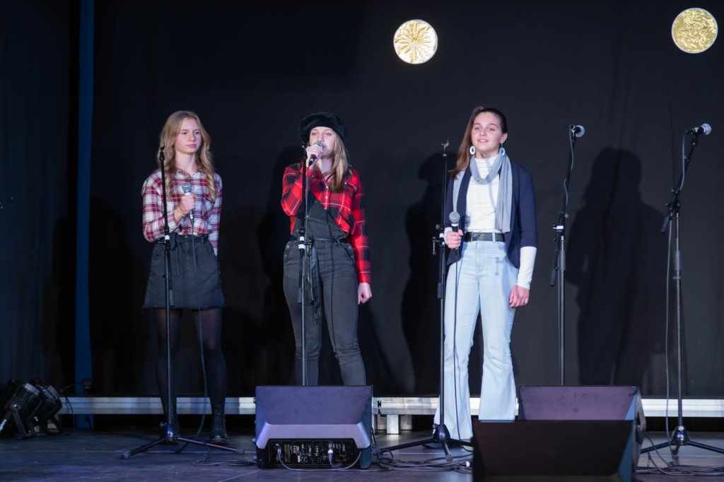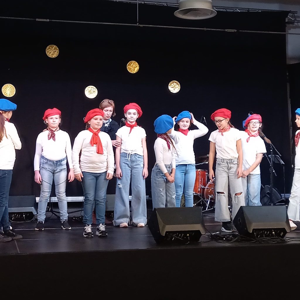 Na Večeri šansone, naše raspjevane “Francuskinje”  Nina Komočar (6.c), Franka Štrbac (8.c) i Jana Komočar (8.d)., pod vodstvom madame Ane Kos i prof. Aljoše Crnobrnje predstavile su nas  pjesmom Ton combat, a plesna skupina Rasplesane iskrice (učenice 3.a i 3.d), pod vodstvom učiteljice Vesne Marjanović, otvorila je Večer šansone plesom Alors on danse. Nastupi naših predstavnica rezultat su radionica francuske šansone koje su se održavale na satovima francuskog jezika.
