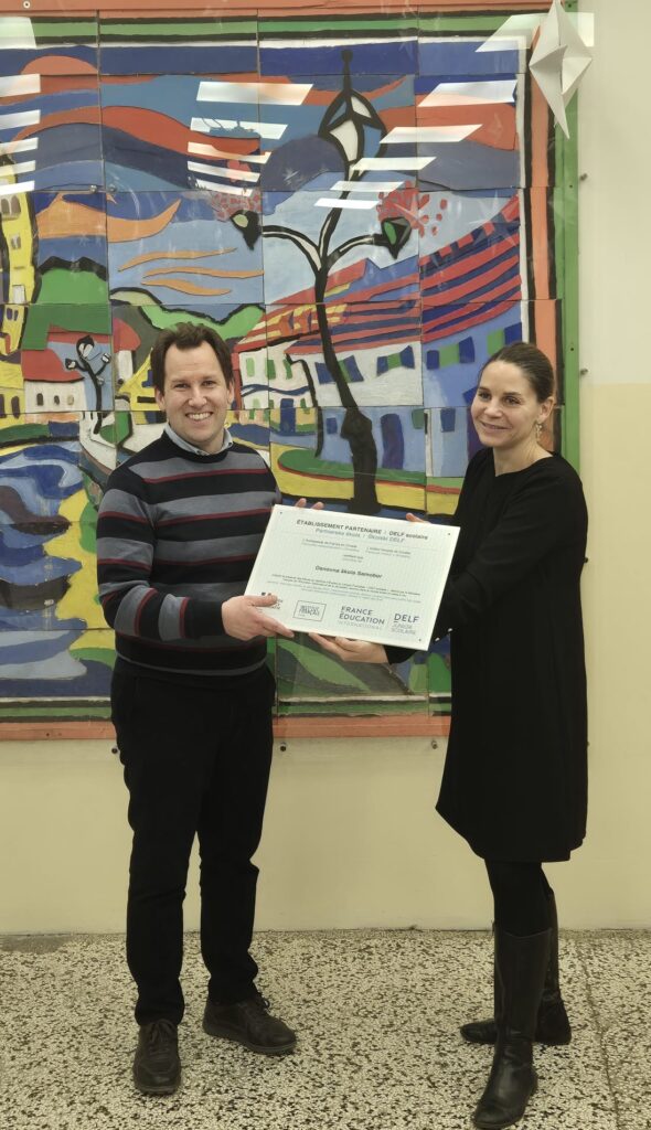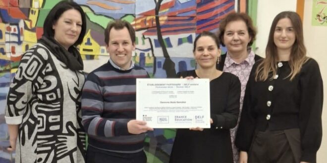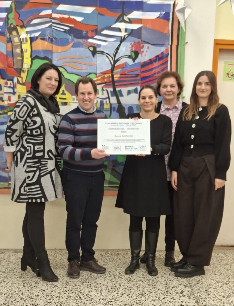 U četvrtak, 15. siječnja, našu školu posjetile su gđa Lucile Chapiro, ataše za jezičnu i obrazovnu suradnju, te gđa Sanja Hoić, pomoćnica za obrazovnu suradnju pri Francuskom veleposlanstvu u Hrvatskoj. Tom prigodom školi su uručile ploču DELF scolaire kojom se ističu partnerske škole, odaje priznanje dugogodišnjoj predanosti škole poučavanju i promicanju francuskog jezika te pripremi učenika za međunarodne ispite DELF scolaire.